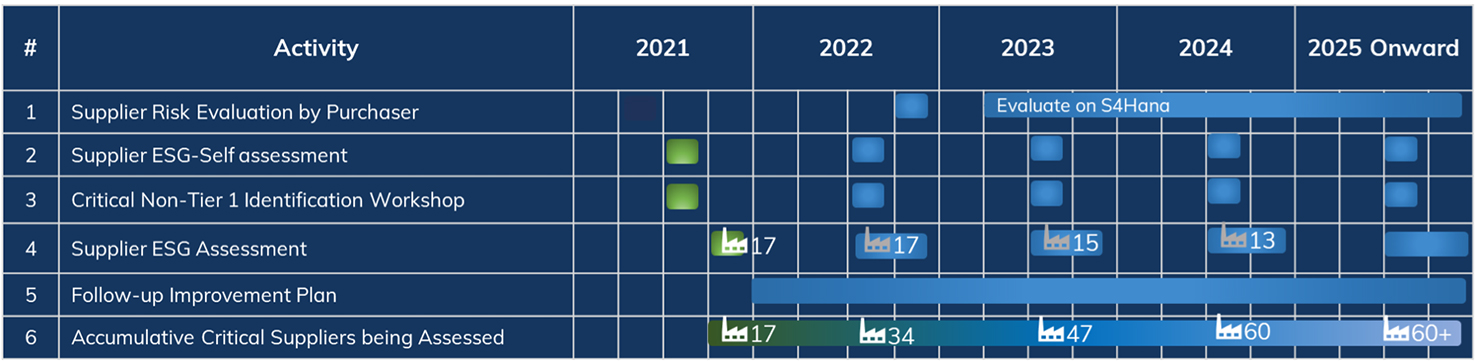 การบริหารความเสี่ยงในระบบห่วงโซ่อุปทานและการกำหนดแผนการพัฒนาคู่ค้าเป็นแนวทางที่บริษัทฯ ได้ดำเนินการเพื่อบริหารและประเมินความเสี่ยงของคู่ค้าอันเป็นการป้องกันและลดความเสี่ยงด้านสิ่งแวดล้อม สังคม และ การกำกับดูแลกิจการที่ดีของ