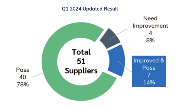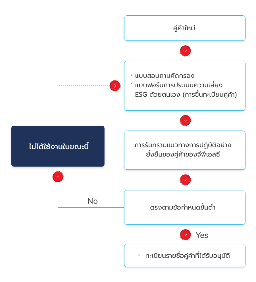 ทั้งนี้ คู่ค้าสามารถเข้าดูสรุปและดาวน์โหลดคะแนนการประเมินความเสี่ยงด้านสิ่งแวดล้อม สังคม และธรรมาภิบาลได้ บริษัทฯ จะใช้คะแนนสุดท้ายดังกล่าวเป็นคะแนนคัดกรองความเสี่ยงเบื้องต้นในกระบวนการตรวจสอบคุณสมบัติเบื้องต้น