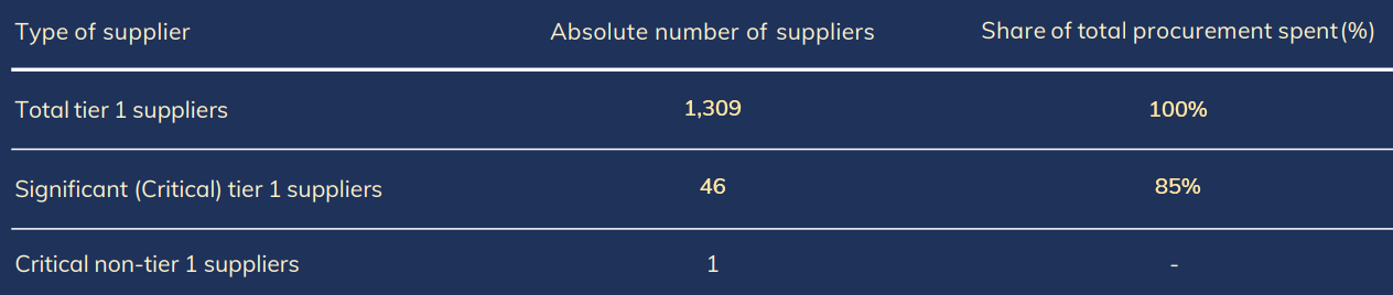 ประธานเจ้าหน้าที่บริหารและกรรมการผู้จัดการใหญ่ มีหน้าที่ดูแลโครงการสิ่งแวดล้อม สังคม และธรรมาภิบาล (ESG) สำหรับคู่ค้า ซึ่งดำเนินการภายใต้การกำกับดูแลของรองกรรมการผู้จัดการใหญ่การพาณิชย์และจัดซื้อ และหน่วยงานรับผิดชอบหลัก ได้แก่ เจ้าหน้าที่ฝ่ายจัดซื้อและคลังพัสดุ