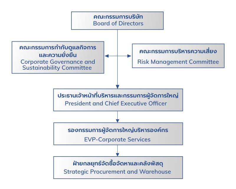บริษัทฯ ได้มอบหมายให้คณะกรรมการบริษัทกำกับดูแลการจัดการคู่ค้าในภาพรวมและโครงการสิ่งแวดล้อม สังคม และธรรมาภิบาล สำหรับคู่ค้า ให้สอดคล้องกับวิสัยทัศน์และผลักดันการดำเนินการให้เกิดผลสัมฤทธิ์ อีกทั้งเพื่อให้มั่นใจว่าบริษัทให้ความสำคัญสูงสุดกับการดำเนินการเหล่านี้ โดยได้มีการแบ่งและมอบหมายหน้าที่การกำกับดูแลดังกล่าวของคณะกรรมการบริษัท ให้แก่คณะกรรมการกำกับดูแลกิจการและความยั่งยืน และคณะกรรมการบริหารความเสี่ยง